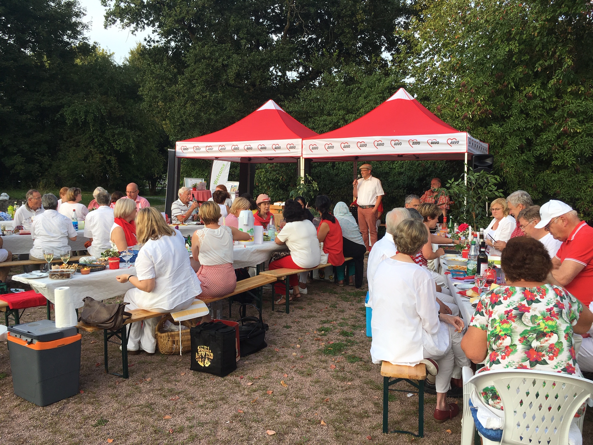 Impressionen vom Dinner in Weiß/Rot, das sich zu einem Treffen von alten Freunden und neuen Bekannten entwickelt hat. Viele Besucher*innen kommen schon seit Jahren, aber es finden sich auch immer wieder neue ein. Beim (schweißtreibenden) Aufbauen drohten noch Gewitterwolken – später war es wieder sonnig und die Gäste strömten herbei. Auf dem Video (unten auf der Seite) hört und sieht man, wie das Duo Zeitensprung sie mit einem passenden Lied begrüßt. Es war ein wunderschöner Abend: sommerlich warm, gesellig, inspirierend. Und der Himmel war sternenklar!