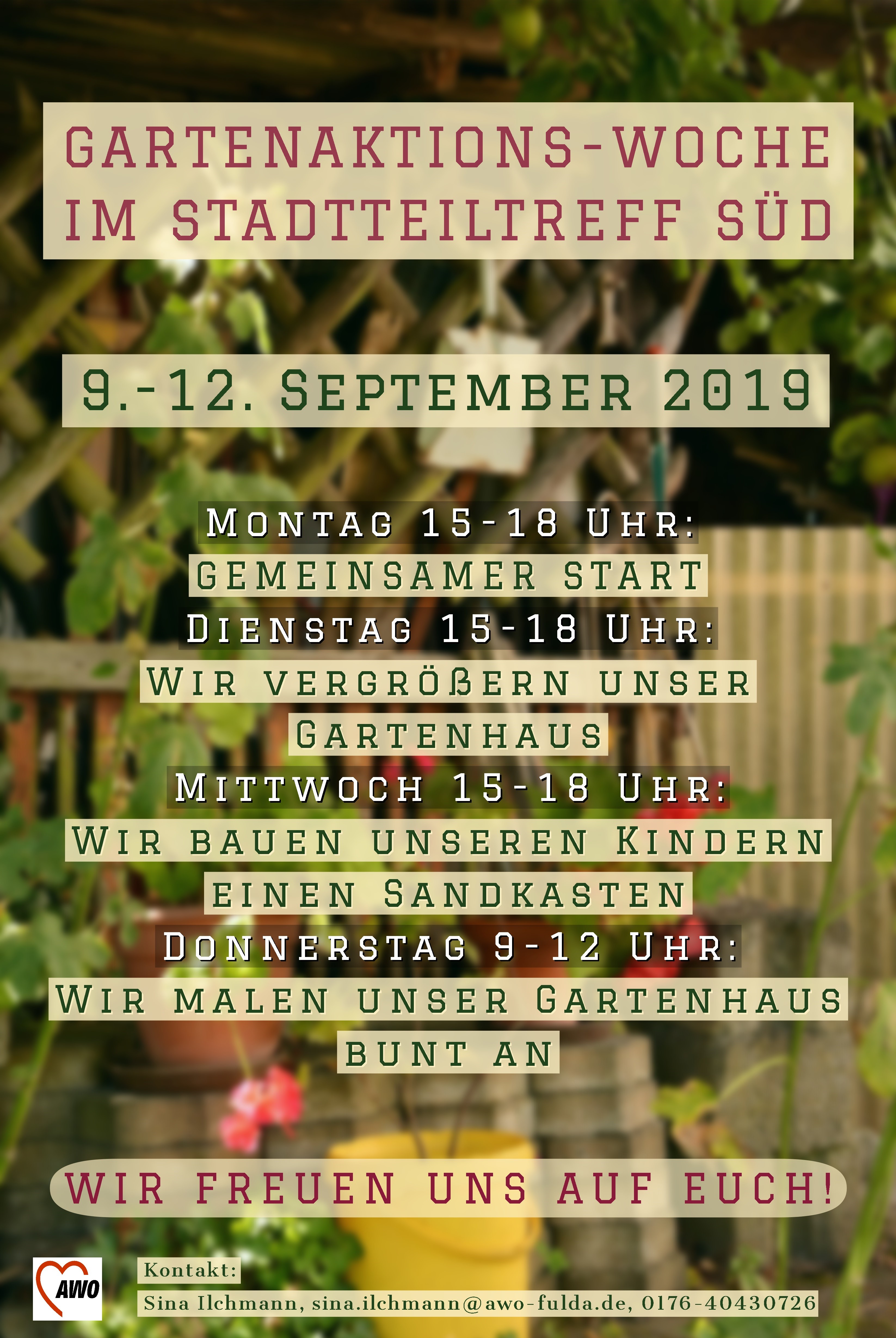 Insbesondere laden wir herzlich zur Garten-Aktionswoche vom 9.-12. September ein! Gemeinsam mit vielen helfenden Händen wollen wir den Garten verschönern und neu gestalten, sodass er noch gemütlicher wird. Es ist eine Möglichkeit, neue Menschen kennenzulernen, sich aktiv einzubringen und gemeinsam etwas anzupacken.