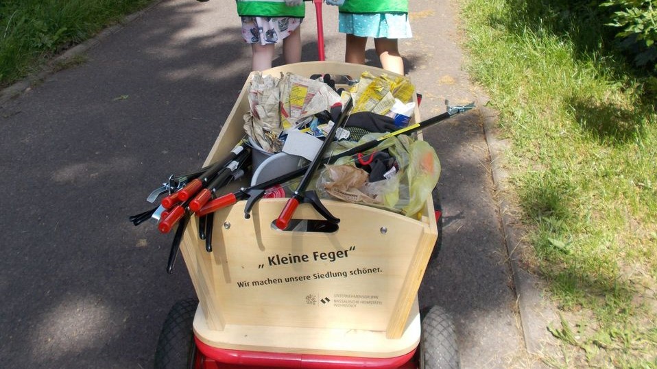 Das Vorbild für diesen Nachmittag war das Projekt „Kleine Feger Ziehers-Nord“. Gefördert von der Unternehmensgruppe Naussauische Heimstätte Wohnstadt zieht eine Gruppe von Grundschulkindern wöchentlich mit dem Bollerwagen durch den Stadtteil und hält die Wegränder sauber. So lernen die Teilnehmer von klein auf den richtigen Umgang mit Müll und tun etwas für den gesamten Stadtteil. Theoretische Inhalte zu Umweltschutz und Recycling werden spielerisch durch Ehrenamtliche aufbereitet. Durchgeführt wird das Angebot durch das AWO-Stadtteilbüro Ziehers-Nord, welches nun gern in die Kindertagesstätte kam.