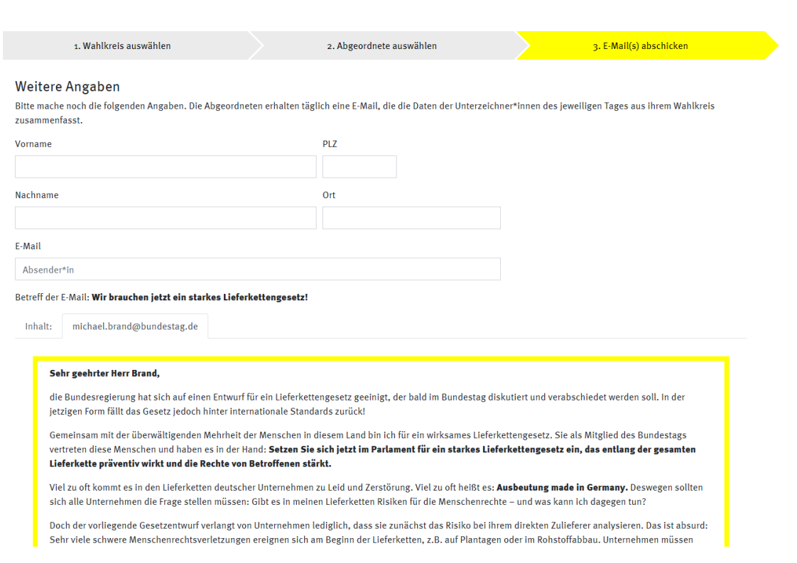 Im April wird der Bundestag über das Lieferkettengesetz beraten. Die Abgeordneten haben dann die Möglichkeit, Nachbesserungen einzufordern. Das ist unsere Chance: Schicken Sie den Abgeordneten aus ihrem Wahlkreis unseren Brief und fordern Sie ein starkes Lieferkettengesetz. Mit dem vorbereiteten Anschreiben geht das online mit ein paar Klicks! Hier finden Sie weitere Informationen: https://lieferkettengesetz.de/lieferkettenbrief/