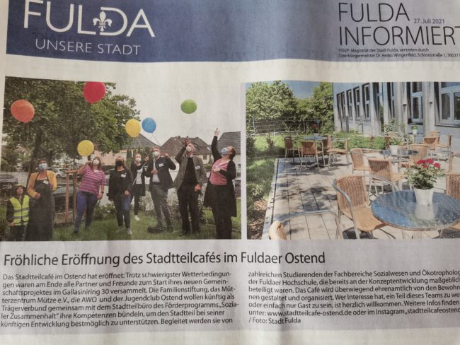 Fulda Ostend/Ziehers-Süd ist um eine Attraktion reicher! Am 09.07.2021 wurde das neue Stadtteilcafé am Gallasiniring 30 im Beisein von allen Vertreter:innen des Trägerverbundes bestehend aus der Familienstiftung, dem Mütterzentrum Mütze e.V., dem AWO-Kreisverband Fulda und dem Jugendclub Ostend eröffnet worden. Von nun an erwarten Sie dort leckere selbstgebackene Kuchen sowie Kaffee und Kaltgetränke. Falls Sie…