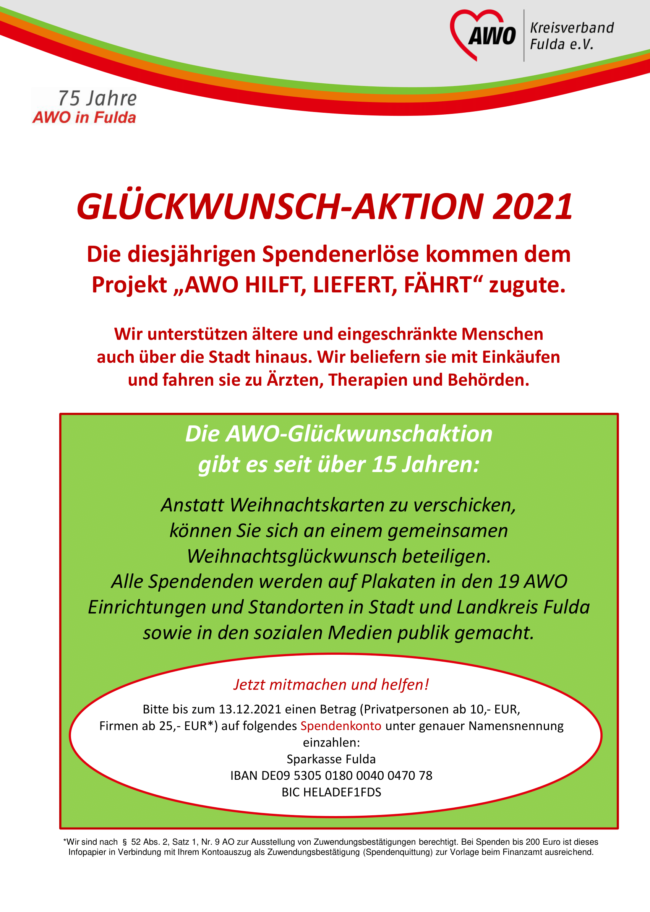 Wir möchten Ihnen unsere diesjährige „Glückwunsch-Spenden-Aktion zu Weihnachten“ ins Gedächtnis rufen. Statt Weihnachtskarten zu verschicken, können Sie sich an einem gemeinsamen Weihnachtsgruß beteiligen und für ein tolles Projekt spenden! Die diesjährigen Spendenerlöse kommen dem Projekt „AWO HILFT, LIEFERT, FÄHRT“ zugute. Das Projekt „AWO HILFT, LIEFERT, FÄHRT“ unterstützt ältere und eingeschränkte Menschen in Fulda und auch…