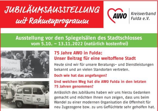 Die AWO Fulda hat im Zeitraum 5.10. – 13.11. eine Ausstellung vor den Spiegelsälen des Stadtschlosses organisiert, um anlässlich ihres Jubiläums noch mal das öffentliche Augenmerk auf ihre Leistungen zu lenken. Thematik ist ihre Arbeit „für ein weltoffenes Fulda“. Dazu wurde ein Stadtrundgang konzipiert (mit Broschüre) und es gibt neben Rollups auch Mitarbeiterportraits und…