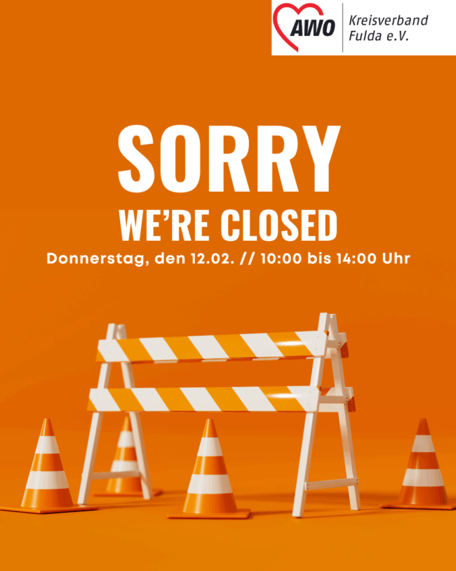 Wegen einer Sicherheitsunterweisung sind wir am Donnerstag, den 12.02.2026 zwischen 10:00 und 14:00 Uhr nicht verfügbar. Das gilt für alle Standorte des AWO-Kreisverbandes Fulda e. V.   Aufgrund dessen müssen alle regelmäßigen Angebote/Projekte/Beratungen, die in diesen Zeitraum liegen, leider entfallen. Wir sind in dieser Zeit auch nicht telefonisch erreichbar.   Vor und nach der Sicherheitsunterweisung…