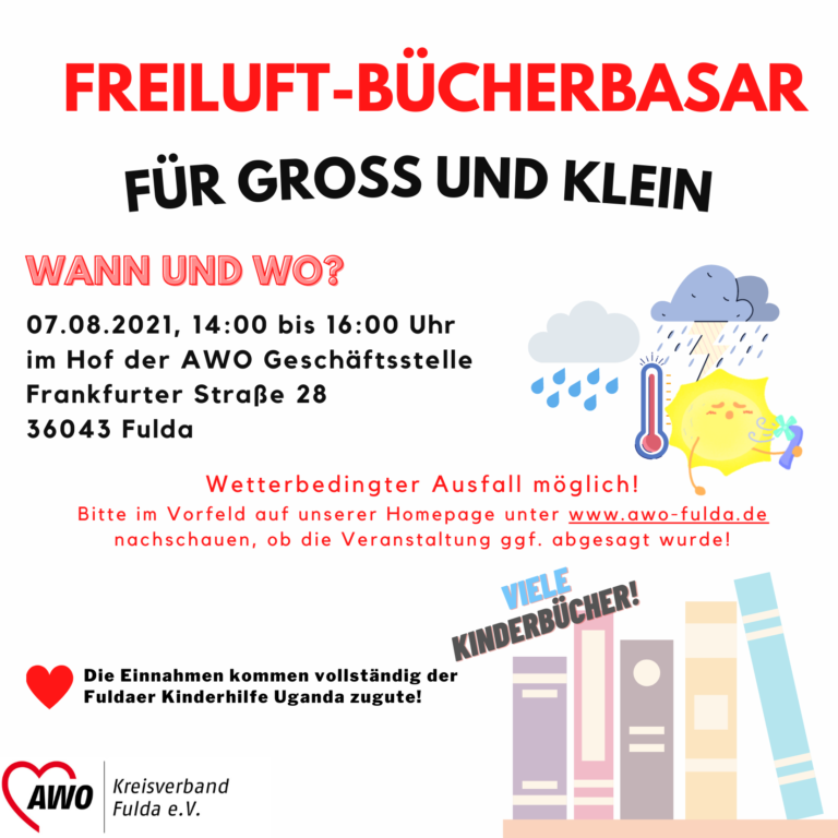 ACHTUNG! ACHTUNG! ACHTUNG! Aufgrund drohender Schauer und Gewitter muss der eigentlich für den 07.08. geplante Freiluft-Bücherbasar leider ausfallen! Wir bedauern diesen Schritt und möchten alle Bücherfreunde gerne dazu einladen, alternativ unser Bücherstudio in der Geschäftsstelle zu besuchen, um sich im Trockenen mit dem gewünschten Lesestoff zu versorgen. Das Bücherstudio öffnet Mo. bis Fr.…
