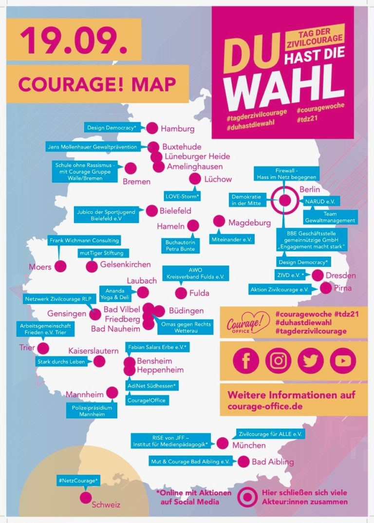 Der Tag der Zivilcourage bietet in diesem Jahr deutschlandweit viele online-Veranstaltungen und er wurde auf die Spanne einer Woche ausgeweitet. Unser Beitrag dazu ist: Dienstag, 21. September 2021 17:30–19:30 Uhr – Bürgerzentrum Ziehers–Süd, Dingelstedtstraße 12, 36043 Fulda Vortrag zum Tag der Zivilcourage “NICHT DEINE SCHULD– wie wir Betroffene von psychischer Gewalt besser schützen können” Psychische…