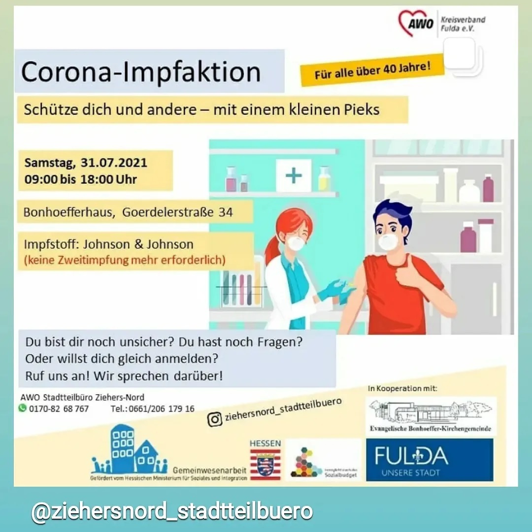 Sich und andere schützen: Am 31. Juli 2021 können sich von 9:00 bis 18:00 Uhr alle Personen über 40, die noch nicht geimpft sind, in Ziehers-Nord im Bonhoefferhaus (Goerderlerstraße 34) mit dem Impfstoff Johnson & Johnson impfen lassen!